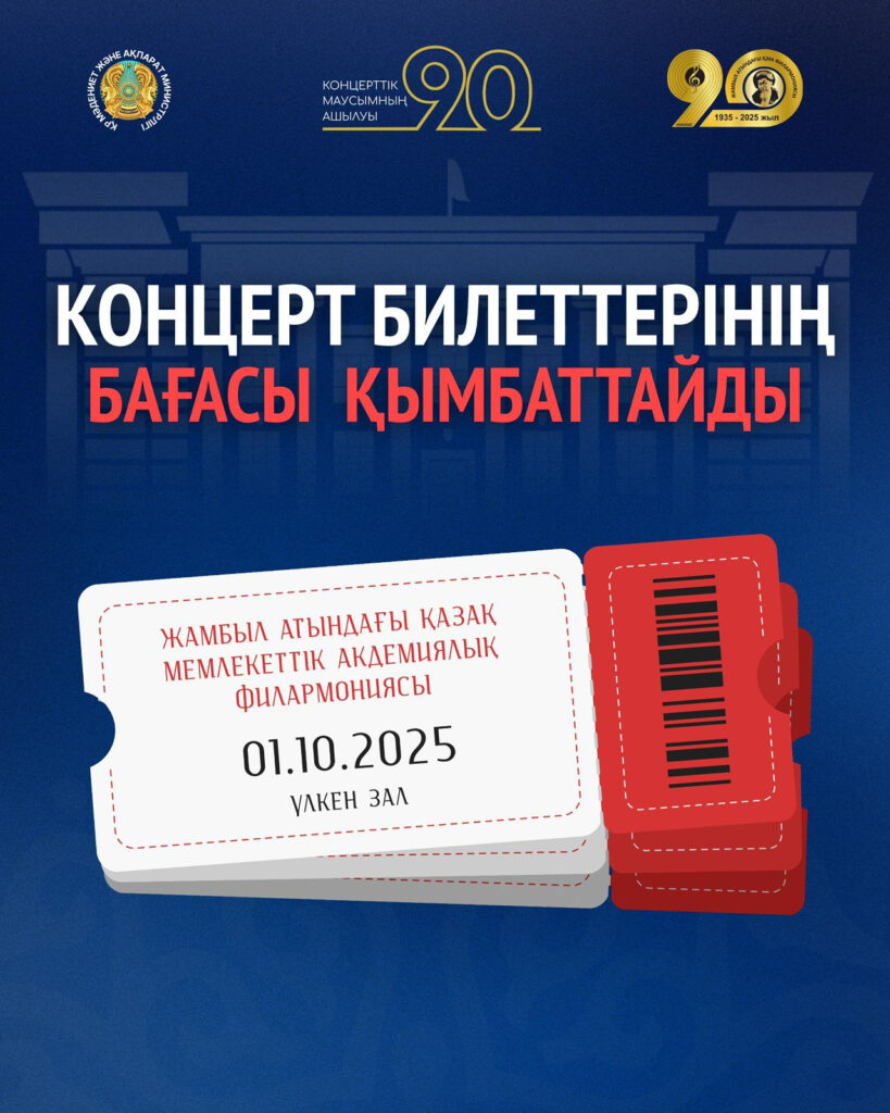 90-маусымда билет бағасы қымбаттайды! Құрметті оқырман, Жамбыл атындағы Қазақ мемлекеттік академиялық филармониясы өз көрермендерін 90-шы концерттік маусымының бағдарламаларымен қуантады. Осы орайда, 2025 жылдың қазан айынан бастап, филармония концерттеріне арналған билеттер мен абонементтердің бағасының өзгеретінін (қымбаттайтынын) хабарлаймыз! Филармония билет бағаларының қымбаттау себептері: — Концерттердің көркемдік деңгейін арттыру; — Әртістердің шығармашылық дамуы мен өнер сапарларға шығуына қолдау […]
