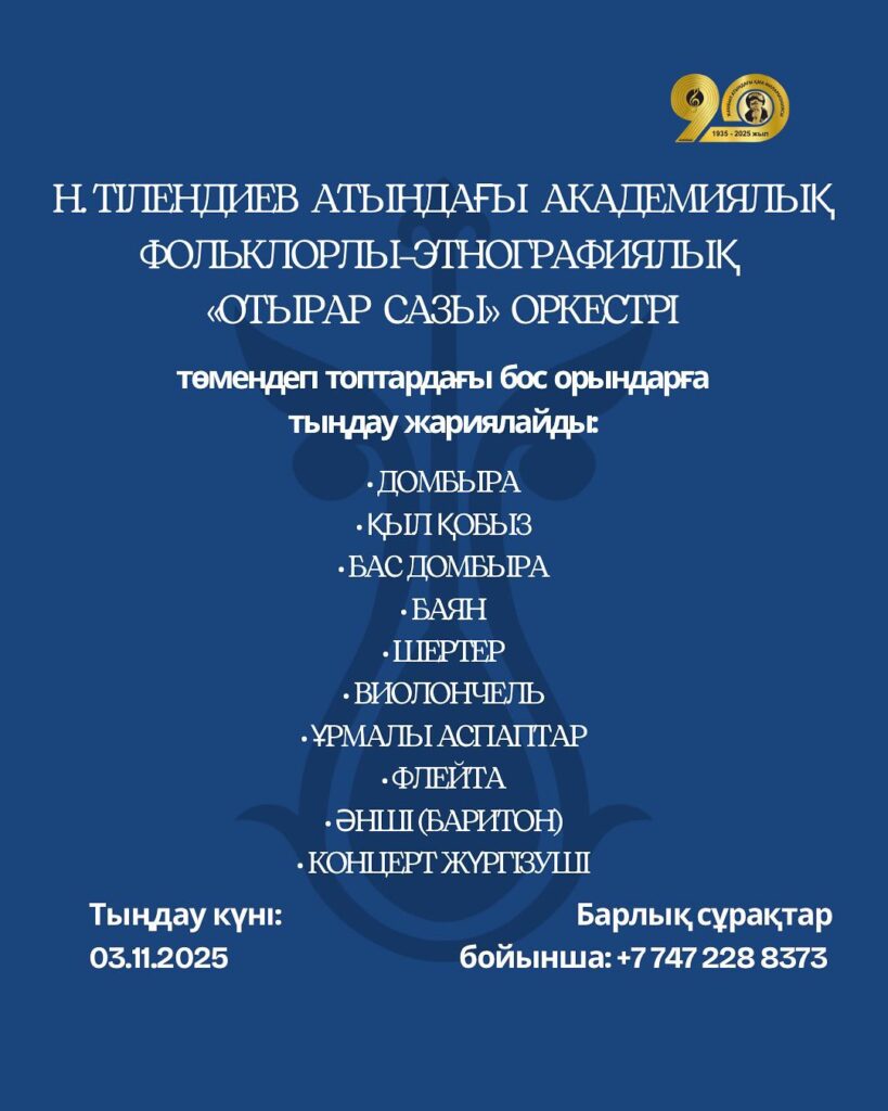 * ДОМБЫРА * ҚЫЛ ҚОБЫЗ * БАС ДОМБЫРА * БАЯН * ШЕРТЕР * ВИОЛОНЧЕЛЬ * ҰРМАЛЫ АСПАПТАР * ФЛЕЙТА * ӘНШІ (БАРИТОН) * КОНЦЕРТ ЖҮРГІЗУШІ 🗓️ Тыңдау күні: 03.11.2025 📞 Барлық сұрақтар бойынша: +7 747 228 8373