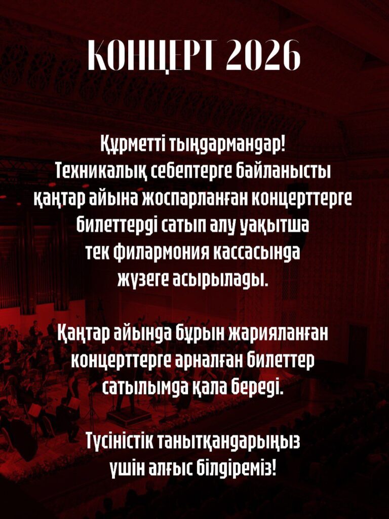 Құрметті тыңдармандар! Техникалық себептерге байланысты қаңтар айына жоспарланған концерттерге билеттерді сатып алу уақытша тек филармония кассасында жүзеге асырылады. Қаңтар айында бұрын жарияланған концерттерге арналған билеттер сатылымда қала береді. Түсіністік танытқандарыңыз үшін алғыс білдіреміз.