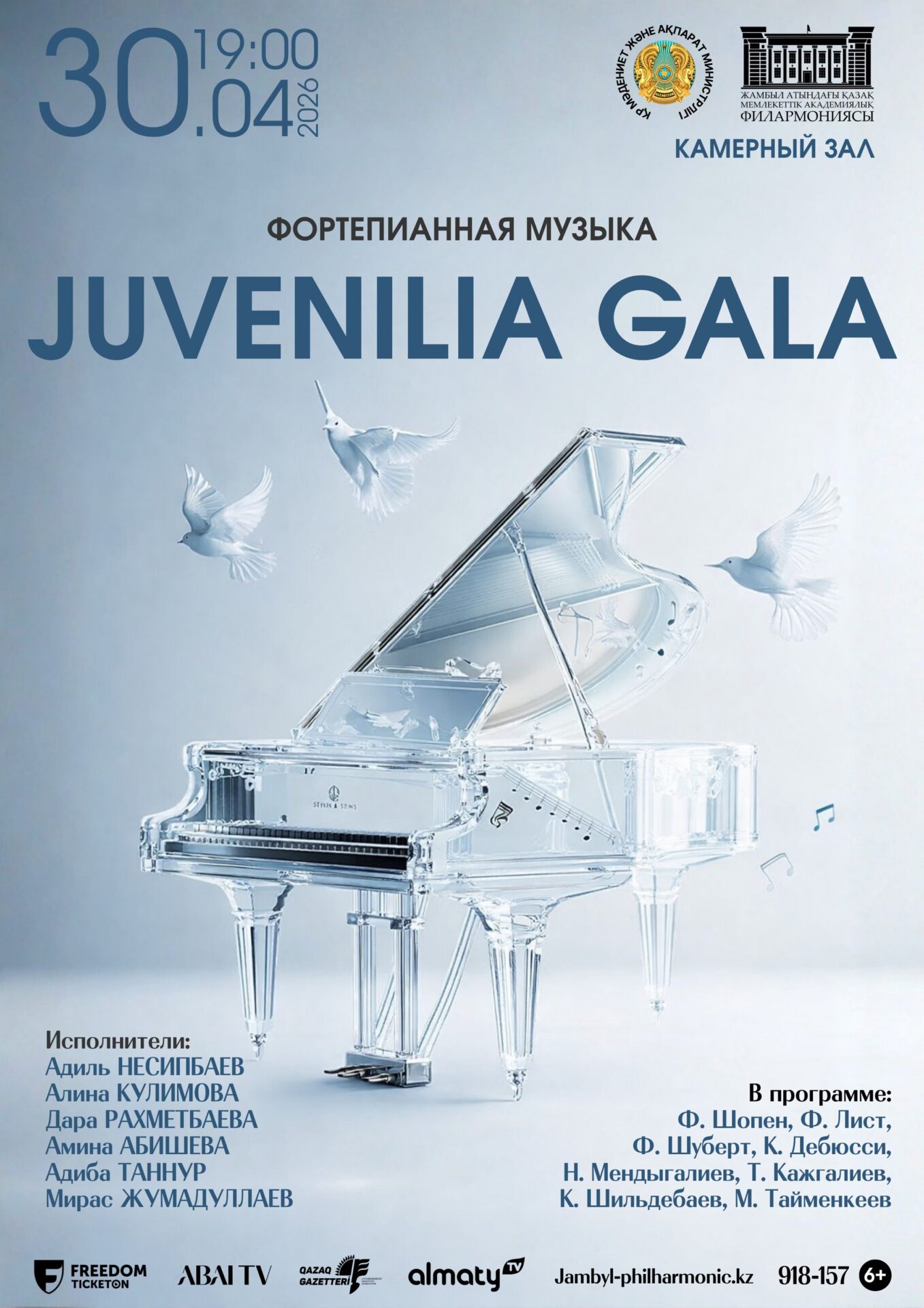 Ф. Шопен, Ф. Лист, Ф. Шуберт, К. Дебюсси, Н. Мендыгалиев,